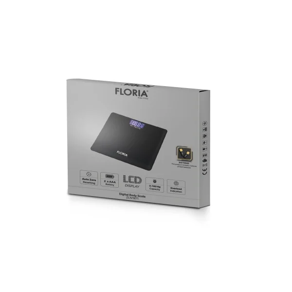 Ķermeņa svari Floria ZLN 1971 no rūdīta stikla, svars 3–180 kg, LCD displejs. Elektroniskie personiskie svari Floria ZLN 1971 ir melnā krāsā un izgatavoti no stikla. Tie var svērt līdz 180 kg ar precizitāti 50 g un mēra svaru diapazonā no 3 līdz 180 kg. Svariem ir automātiskā nulles atjaunošana, Auto ON/OFF funkcija, kā arī zemas baterijas un pārslodzes indikatori. Svars tiek attēlots LCD ekrānā. Ierīce darbojas ar 2 AAA baterijām, kas iekļautas komplektā.